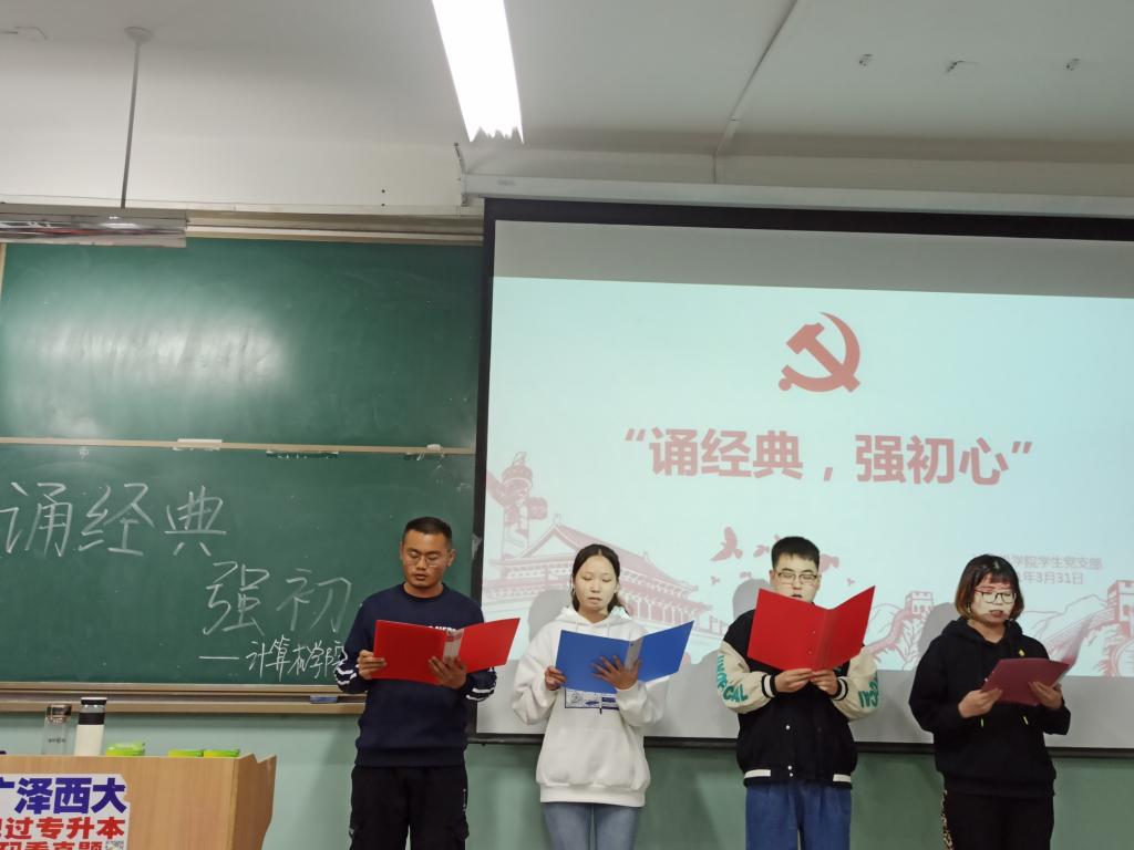 为引导员工党员知史爱国,知史爱党,知史奋进,筑牢红色思想基石、传承四史精神,推动“四史”学习落地落实,3月31日晚,太阳成集团tyc122cc员工第一党支部和第二党支部于沣惠校区教学主楼308联合举办“诵经典,强初心”主题演讲比赛,员工第一党支部书记侯勇、员工第二党支部书记王靖晶以及两个支部党员、积极分子参加。