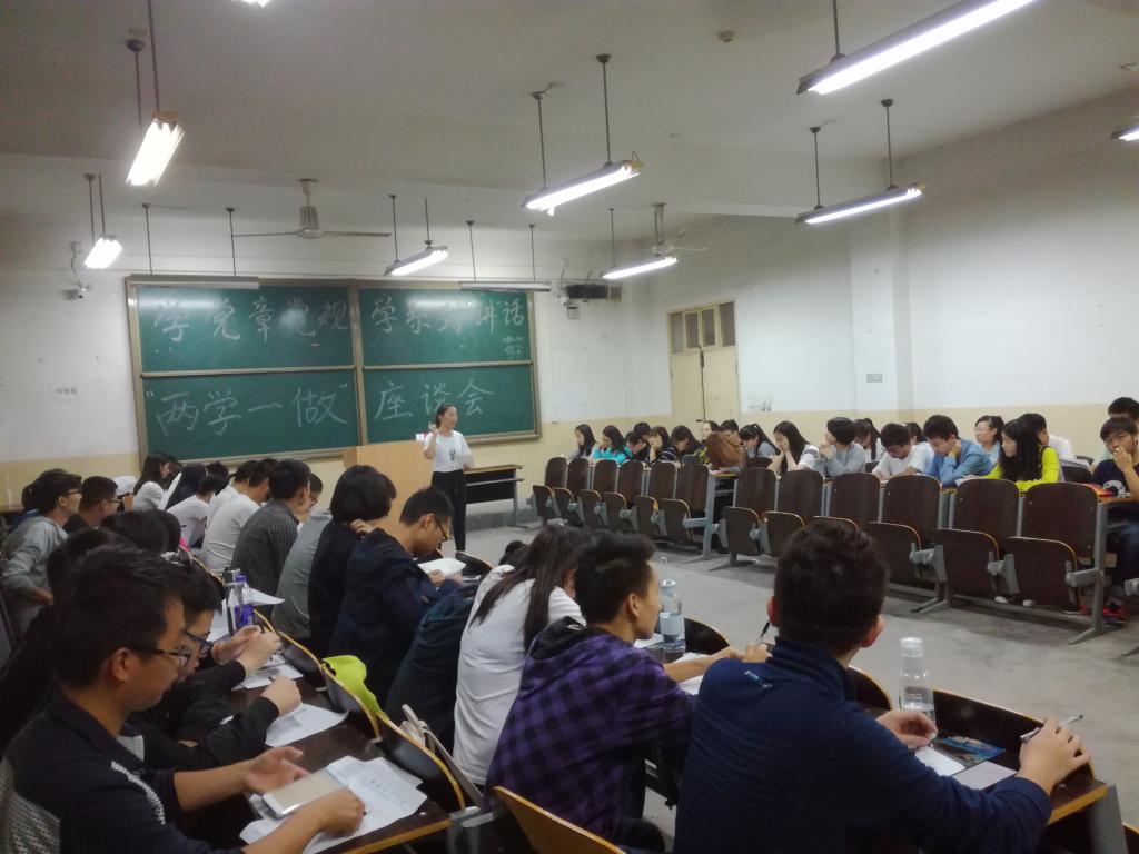 本次座谈会将75名党员和积极分子分为7个组,讨论题分别是:“如何深刻领会习近平总书记系列讲话精神的核心要义?”;“共产党员如何以实际行动做到‘保证党内团结’?”;“如何深刻理解习近平总书记系列讲话中坚持和发展中国特色社会主义这个主题?”;“结合实际,谈谈如何认识开展‘两学一做’专题教育的实践要求。”;“谈谈如何深刻领会实现中华民族伟大复兴的中国梦这个理想目标?”;“老员工党员对党性的理解及其自己应该怎么做?”;“谈谈为什么党员必须把学习党章作为必修课?”;“谈谈如何学习贯彻《中国共产党廉洁自律准则》和《中国共产党几率处分条例》,做一名合格党员?”。各组同学就自己的讨论题展开热烈的讨论,随后各派出一人面对大家进行全方位、深层次的发言,分享学习的心得体会后。