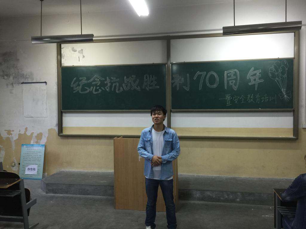 在对抗日战争有了更全面深刻的认识后,各班围绕抗日战争胜利开展合唱、演讲、朗诵、讨论等庆祝活动,从不同的角度表达了对抗日战争胜利70周年的纪念。辅导员米嘉琪老师希望大家珍惜来之不易的和平环境,热爱生活,同时在9·18来临之际做好安全防范工作,严格遵守校规校纪。