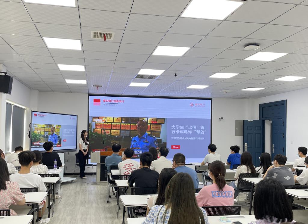 秦农银行工作人员结合相关案例分析、对“断卡”行动、防范网络金融诈骗、反洗钱等知识及进行了详细介绍,通过互动问答等形式向同学们深入浅出地讲解了如何守住自己的“钱袋子”、防范网络诈骗的套路及危害。通过现场答题环节,使大家深刻认识到出租、出借、出售、购买“两卡”等都是违法犯罪行为,更明白了参与“两卡”开办、售卖违法犯罪行为的严重后果。同学们认真听讲,积极参与互动,效果明显。