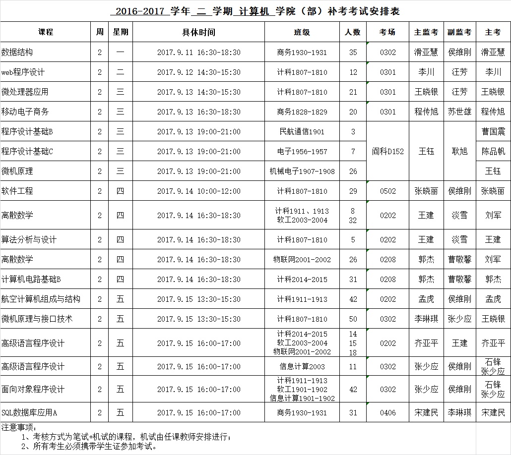 ​2016-2017-2学期课程补考安排表